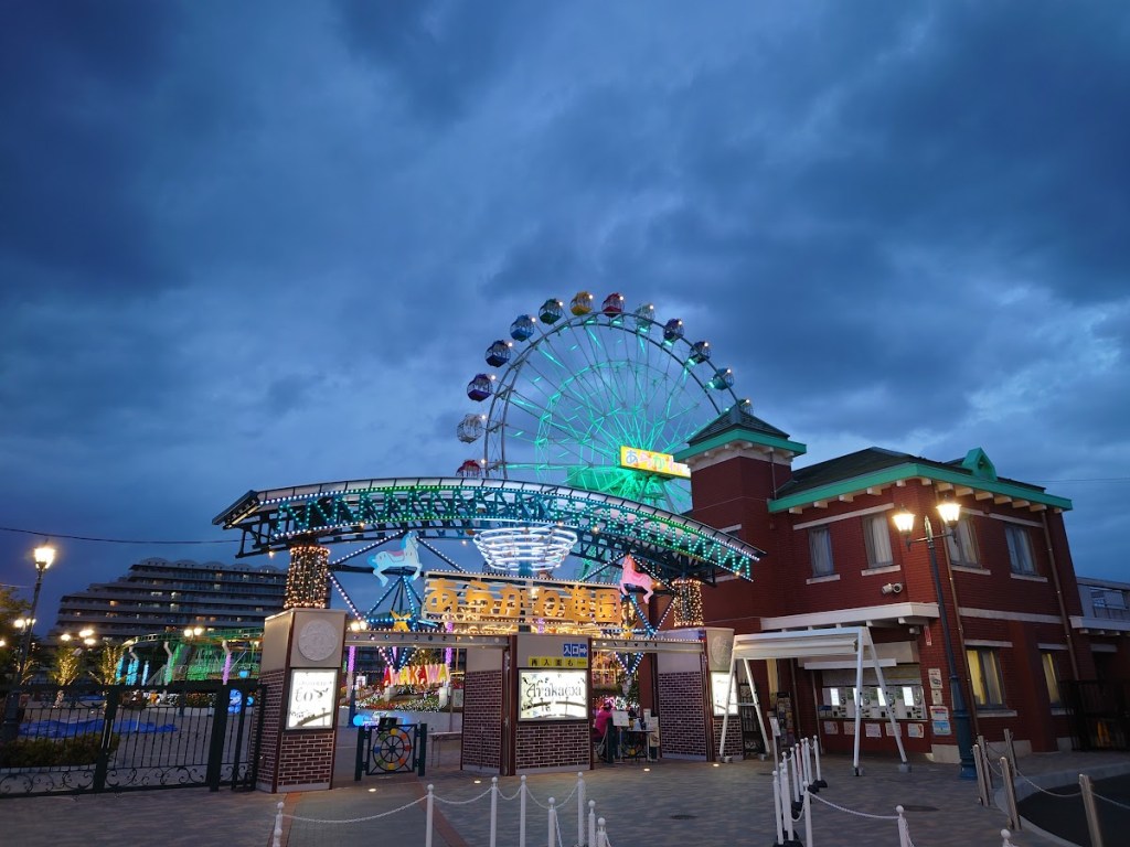 進んでいくと遊園地の入り口があります。アーチ状の大屋根は2022年のリニューアルで新設されたもの。これまた可愛らしくて良いデザインです。右のレンガ調の建物にチケット販売機があります。現在時刻は15:50ごろ。16時から入園可能な割引チケットがあるので、少し待って入園します。