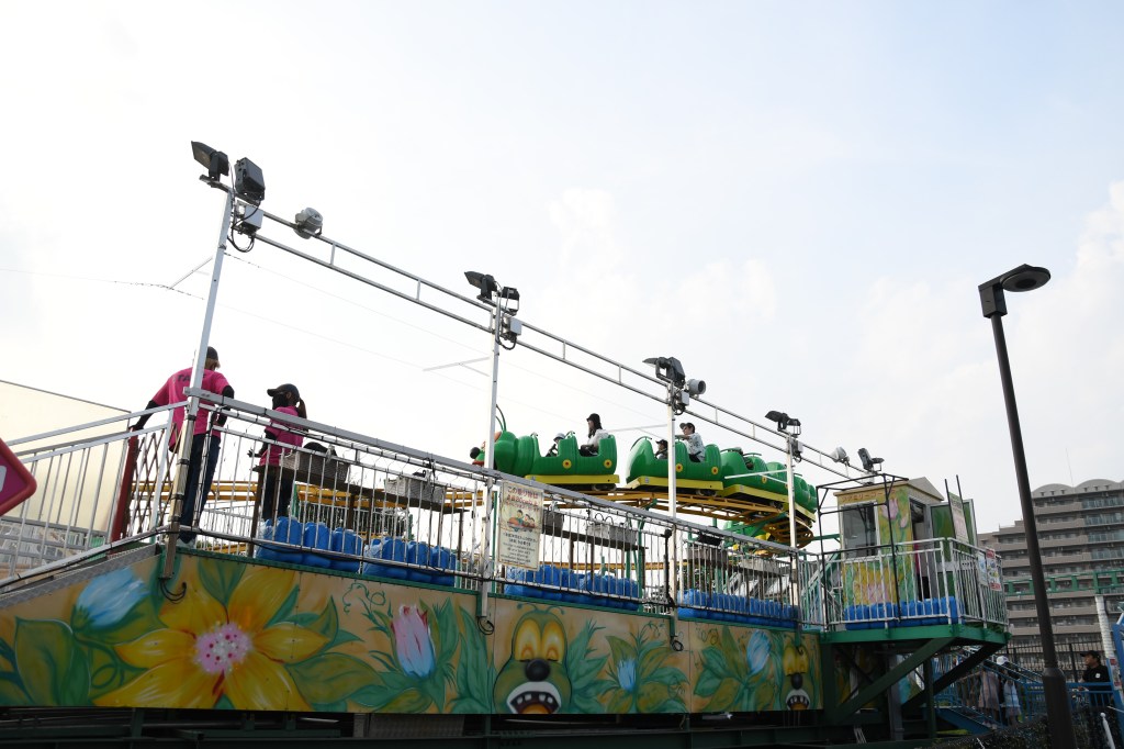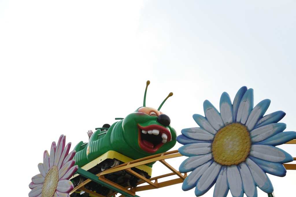 芋虫型のデザインが特徴的な小型のローラーコースターです。ワッキーワームと呼ばれる機種で、国内では三機が営業しています。走行速度はかなり遅く、国内最低速の部類に入ります。