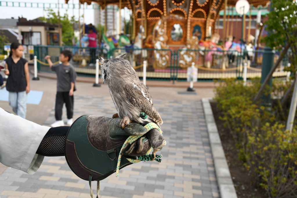おや!入園すると早速フクロウとグリーティングです。アフリカオオコノハズクかな?かわいいですね!さて、アトラクションを見ていきましょう。