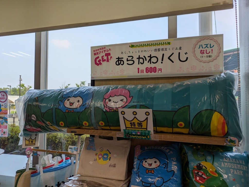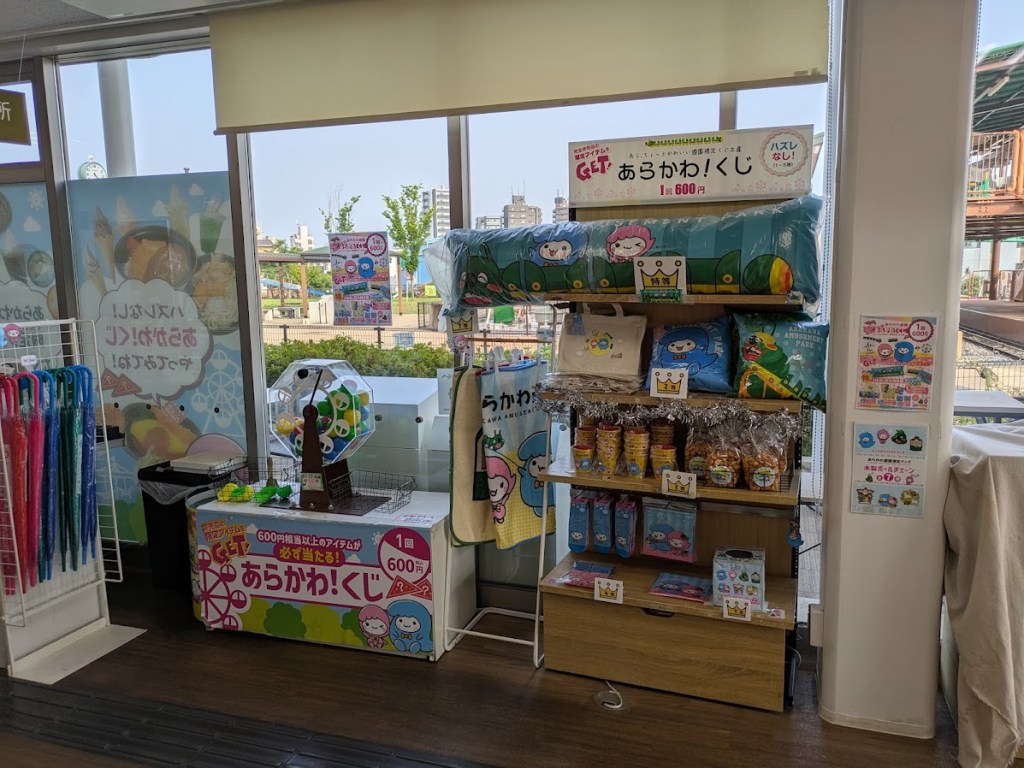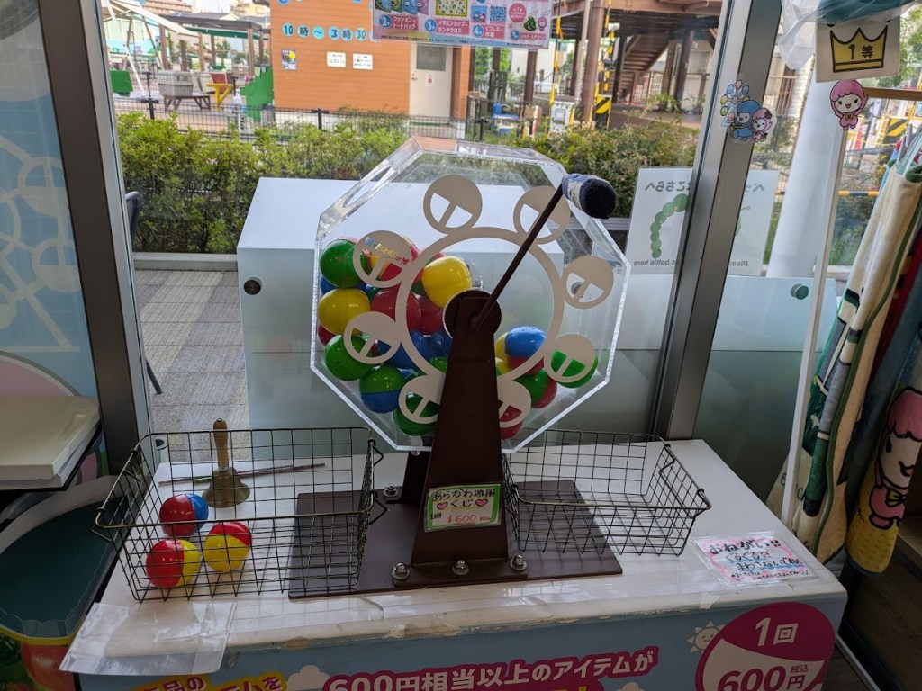 あらかわ!くじです。一回600円でハズレなし。来るたびに運試しとして引いています。特等が当たるとその後の予定に差し支えるので、ご利用は計画的に?抽選器が観覧車のデザインでかわいい!