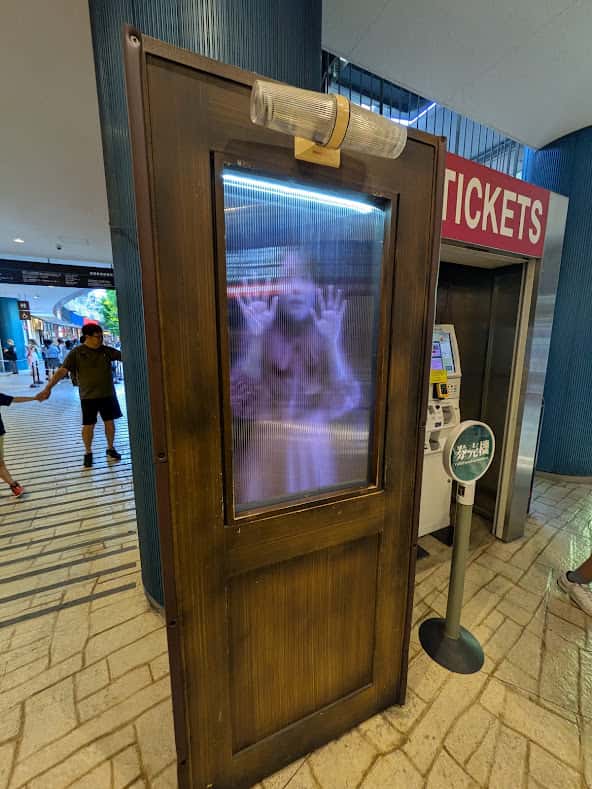 こちらは16時を境に通常編と絶叫編が入れ替わる運営スタイルをとっており、オススメは後者です。さて、そこにある券売機でチケットを買い・・・おや!さっそくお化けの\歓迎が。ありがたいですね。