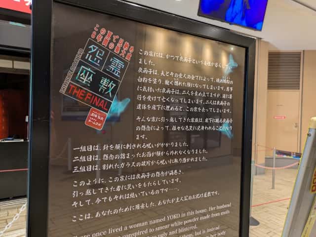 怨霊座敷 THE FINALは、東京都文京区のアーバンリゾート施設「東京ドームシティ」内に所在する期間限定のお化け屋敷です。常設お化け屋敷として2018年から営業している怨霊座敷の特別演出バージョンで、夏期恒例のイベントです。制作は日本を代表するお化け屋敷制作団体と言えるオフィスバーン様。お化け屋敷としてのジャンルはウォークスルー、歩いて入るお化け屋敷です。脅かし演出の鋭さ、密度共に優れたしっかり怖いお化け屋敷となっています。